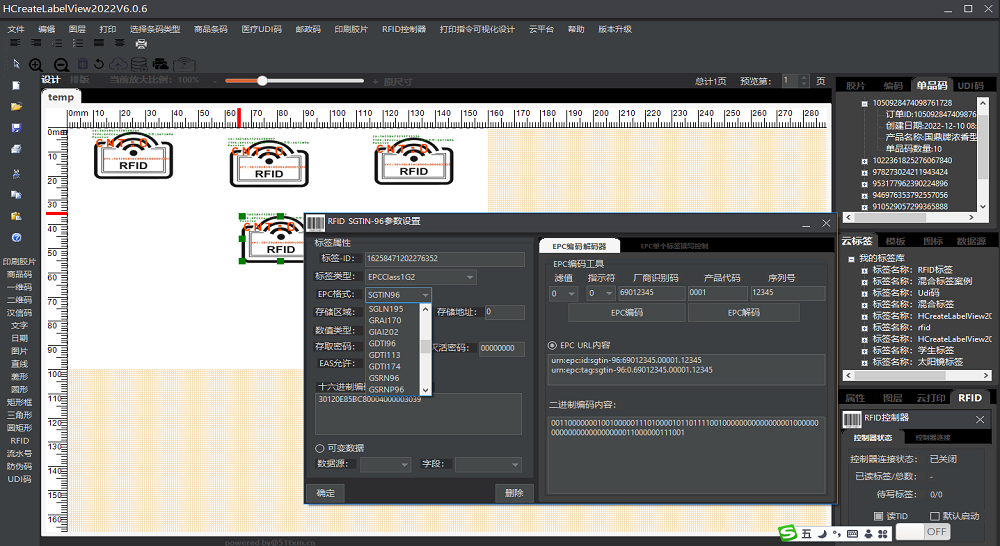 • 软件支持RFID打印机(RFID打印指令)打印RFID标签